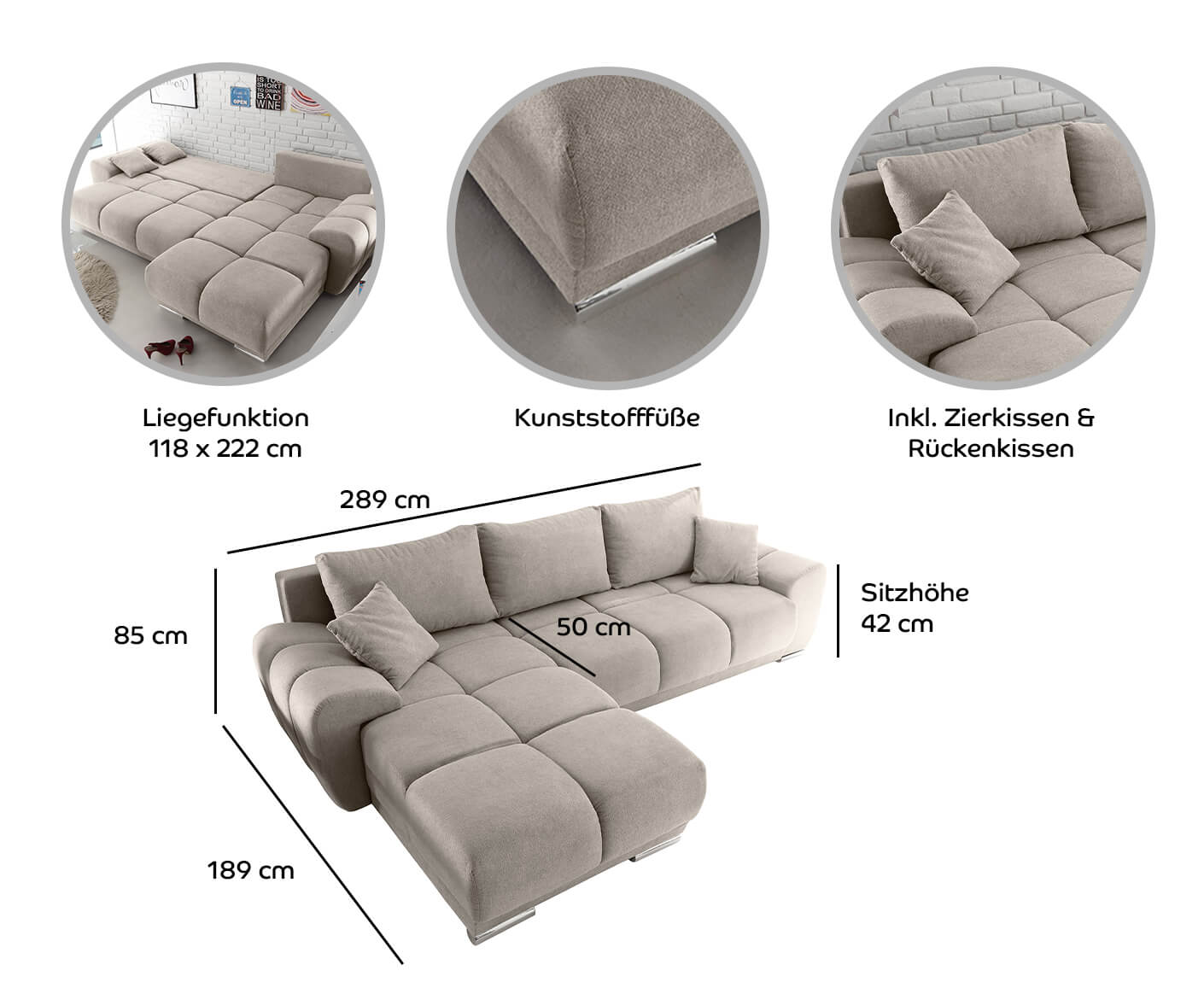 Beschreibung für Anton Ecksofa 289x189 cm, mit Schlaffunktion & Bettkasten
